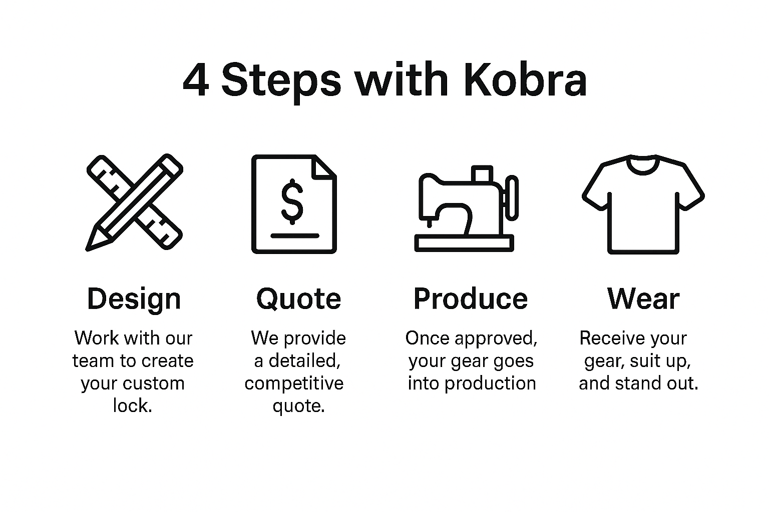 Receive your gear, suit up, and stand out. Whether it’s game day, training, or travel — wear your custom Kobra kit with pride.